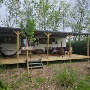 Draußen auf der überdachten Terrasse gibt es Loungesofa, einen Picknicktisch und einen Grill. Im großen Garten ist auch Platz für ein zusätzliches Zelt. Genieße deinen geselligen Aufenthalt in Zeeland mit der ganzen Familie. Ist das Glamping oder nicht?!