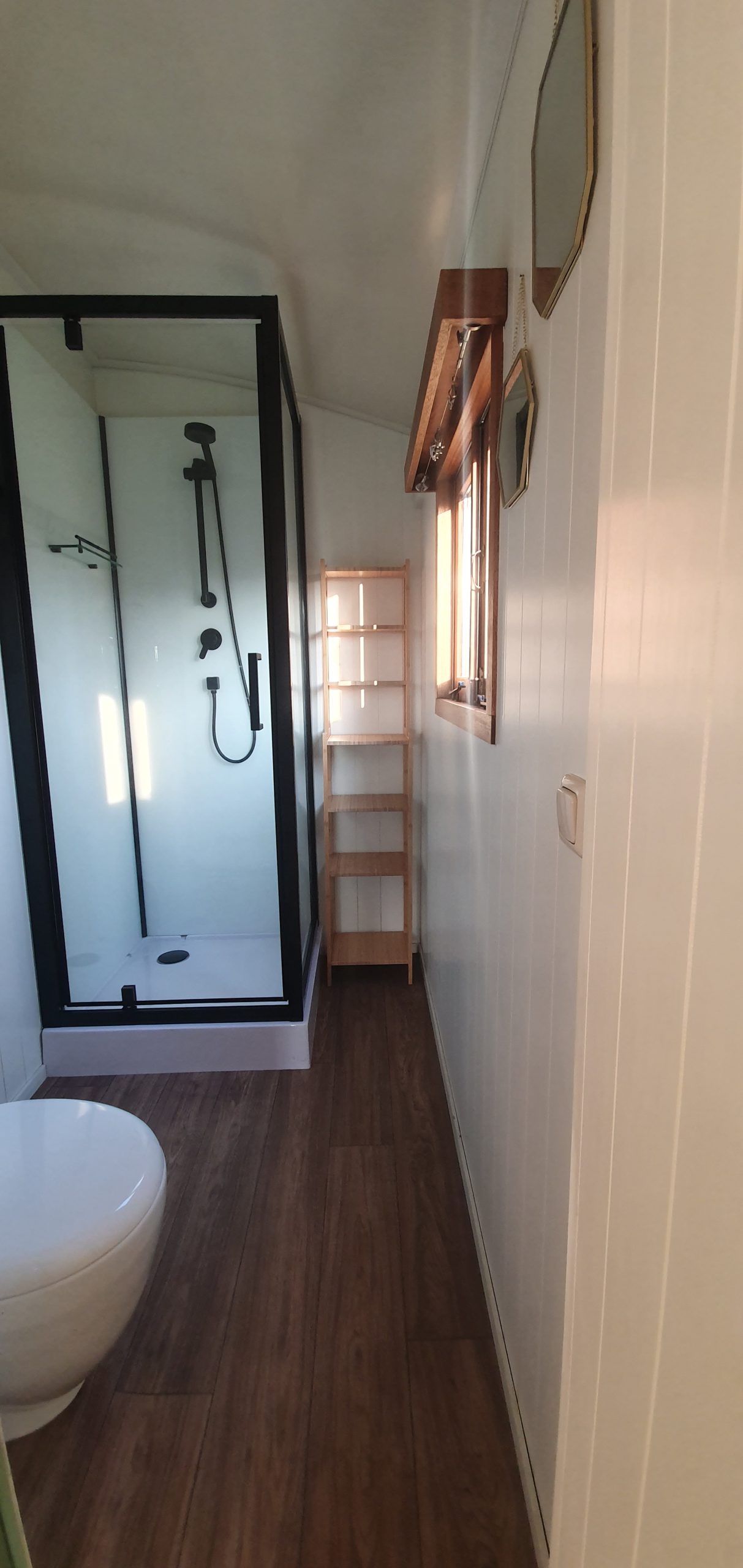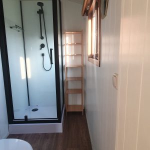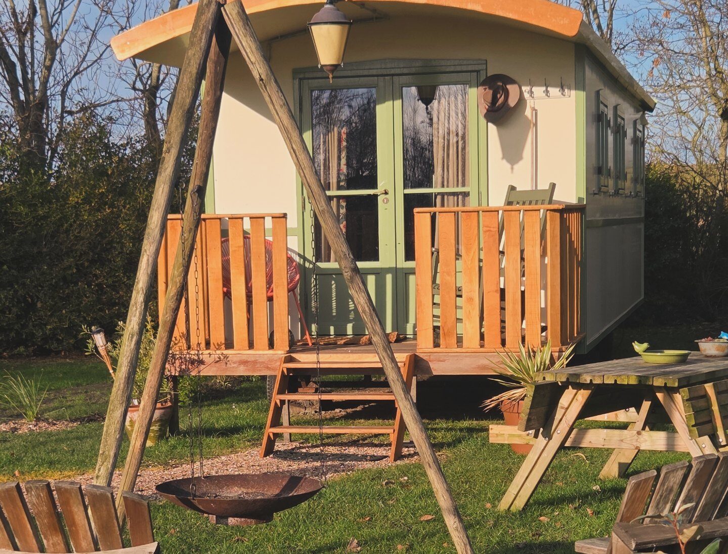 Der Zigeunerwagen ist ausgestattet mit einem Doppelbett, einem Badezimmer mit Dusche und Toilette, einer Küchenzeile mit Gasherd, Kühlschrank, Kochutensilien und Nespresso-Maschine (nachhaltige Kapseln von den Koffiejongens, erhältlich an der Rezeption). Ein Esstisch, eine Sitzecke und ein Holzofen für kühlere Abende. Plattenspieler und Akkordeon stehen für die Stimmung bereit.