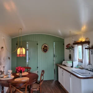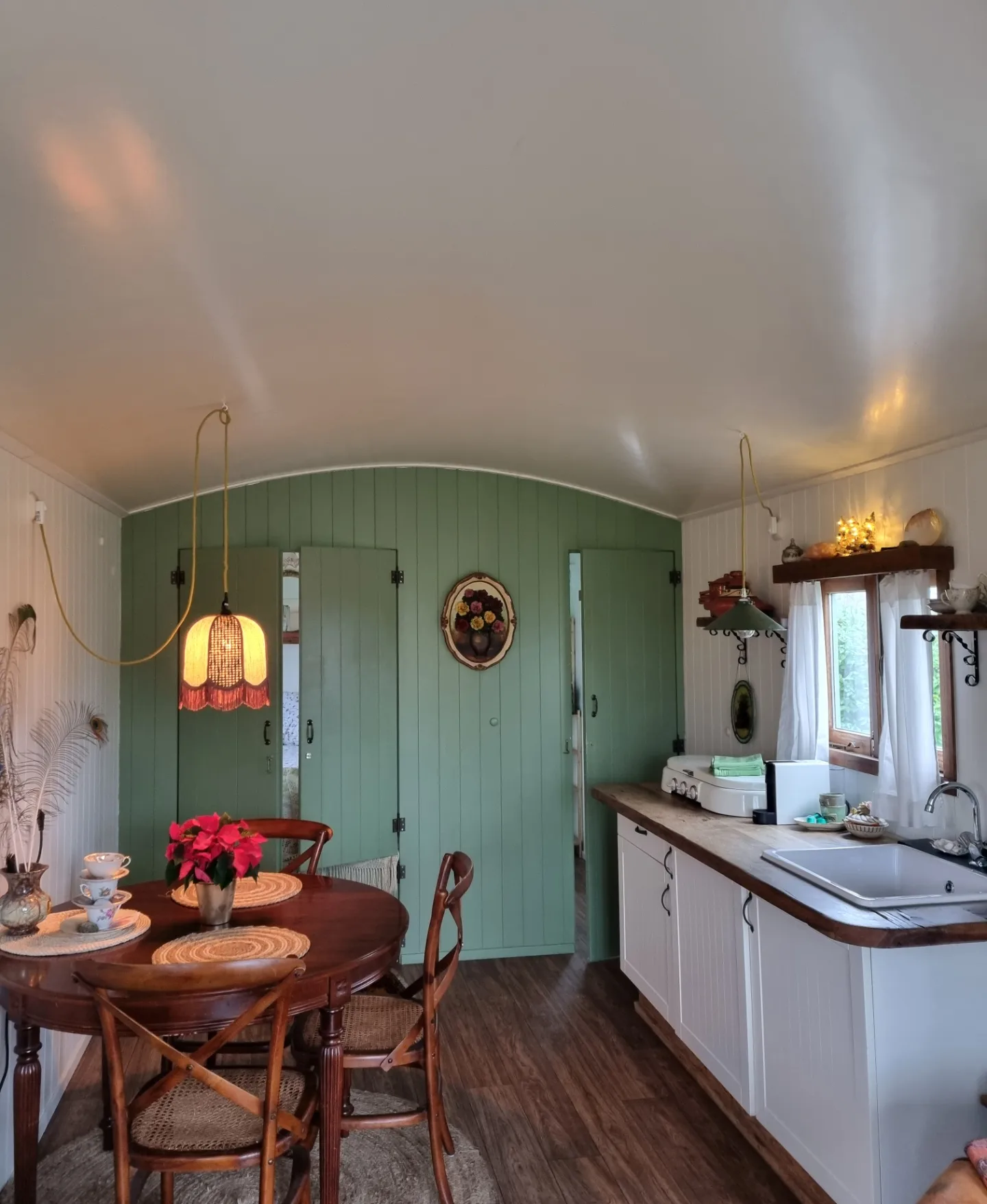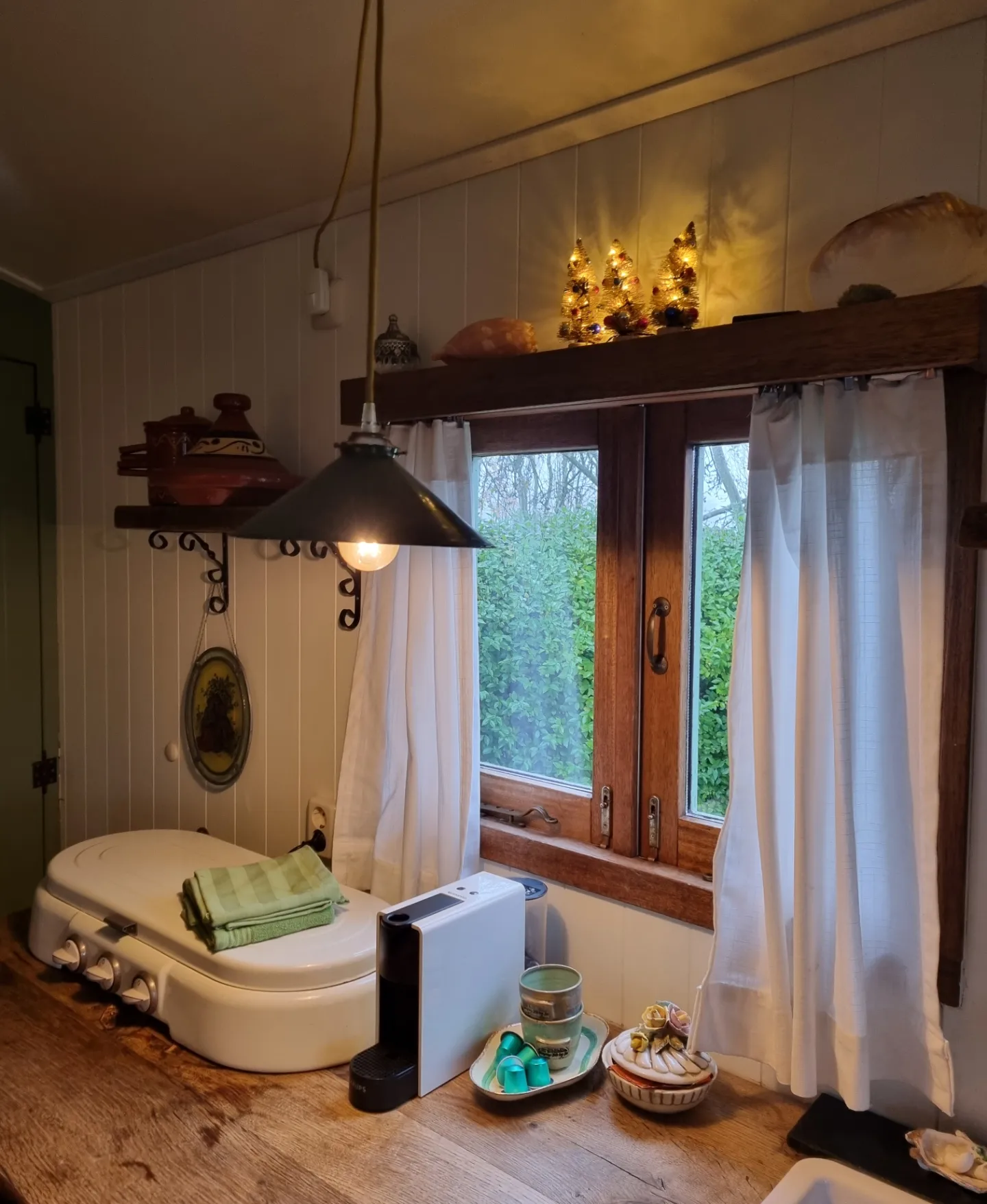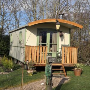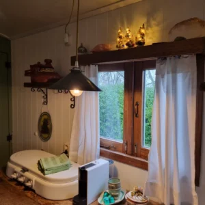 De Gypsy is uitgerust met een tweepersoons bedstee, een badkamer met douche en toilet, een keukentje met gasstel, koelkast, kookgerei en Nespresso machine (duurzame cupjes van de Koffiejongens, in de receptie verkrijgbaar). Een eettafel, zithoekje en een houtkacheltje voor de frissere avonden. Platenspeler en trekzak liggen klaar voor de sfeer. Meneer Petalo zou er jaloers op zijn!