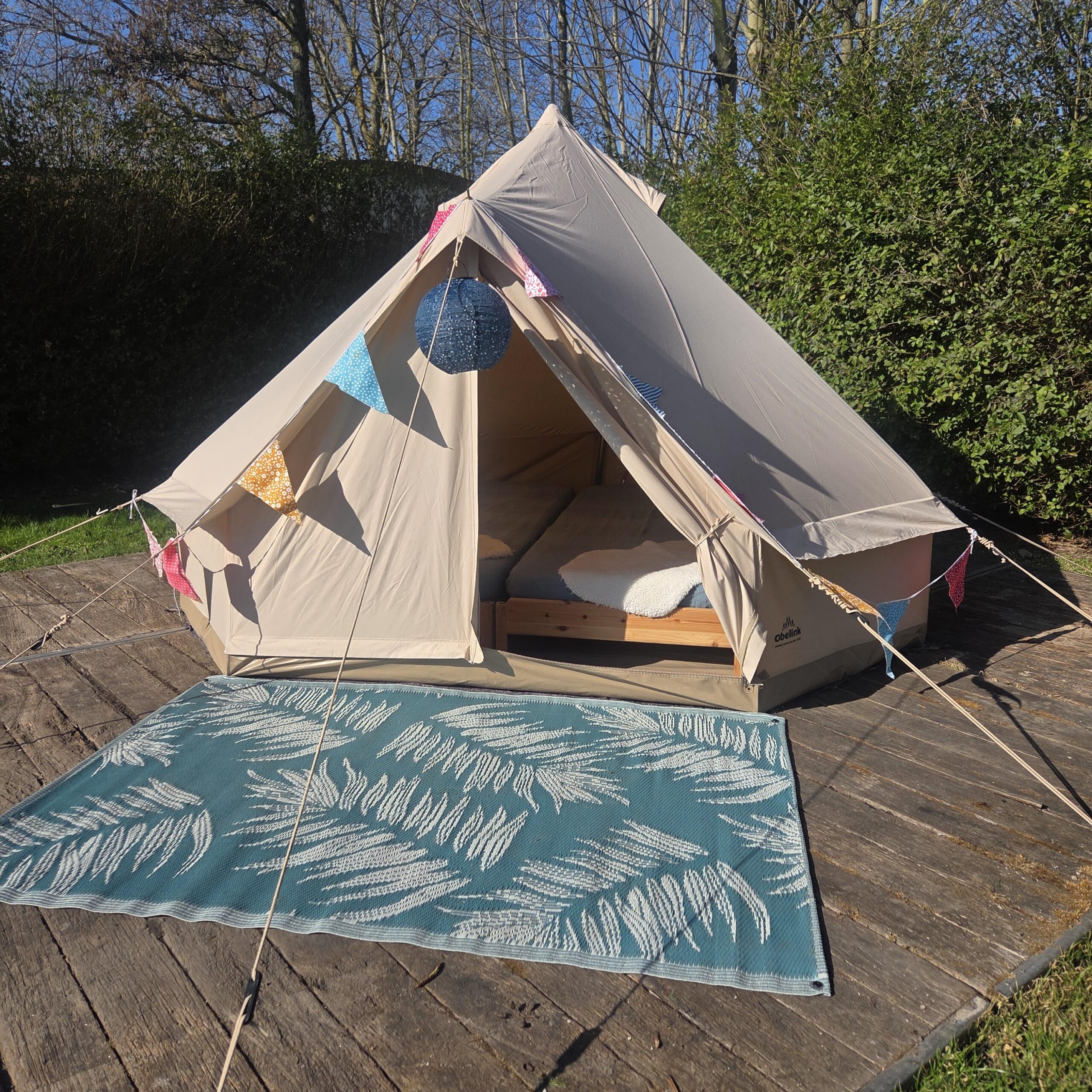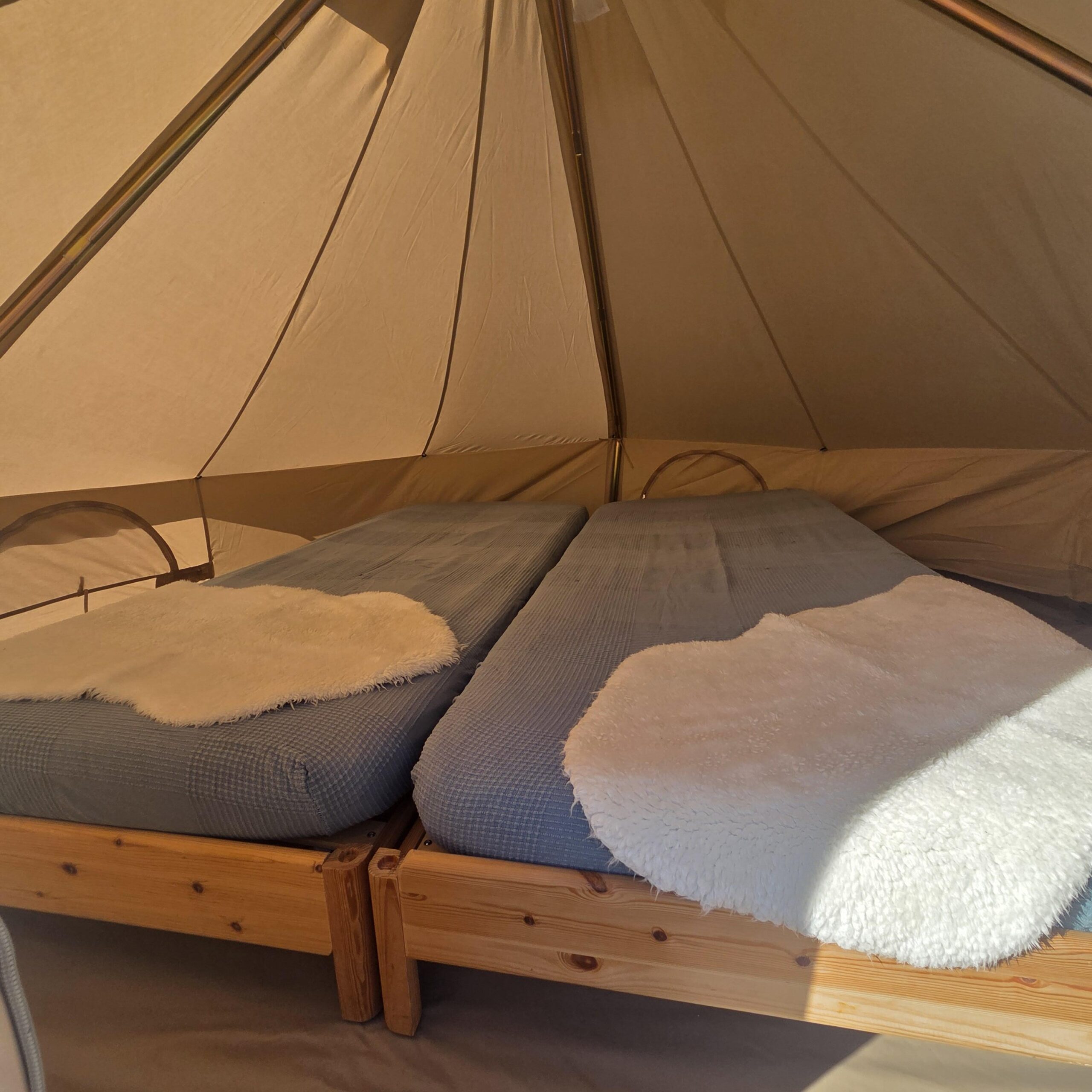 De bedden zijn alvast opgemaakt, hand- en keukendoeken liggen klaar. Tipi Belle heeft een tweepersoonsbed voor extra logees.